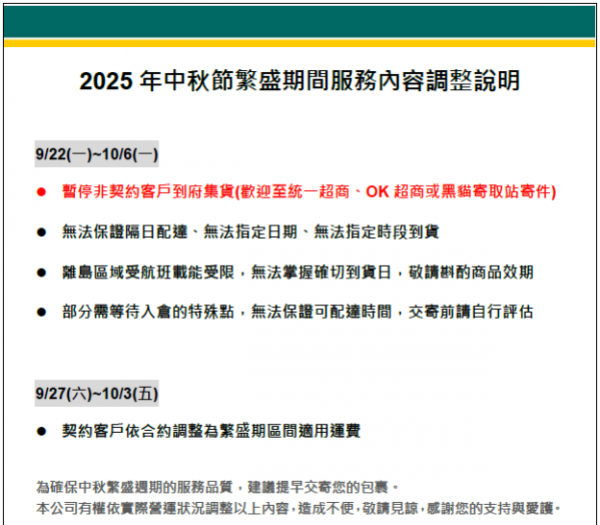 ► 2025年9月22日~10月6日黑貓宅配公告